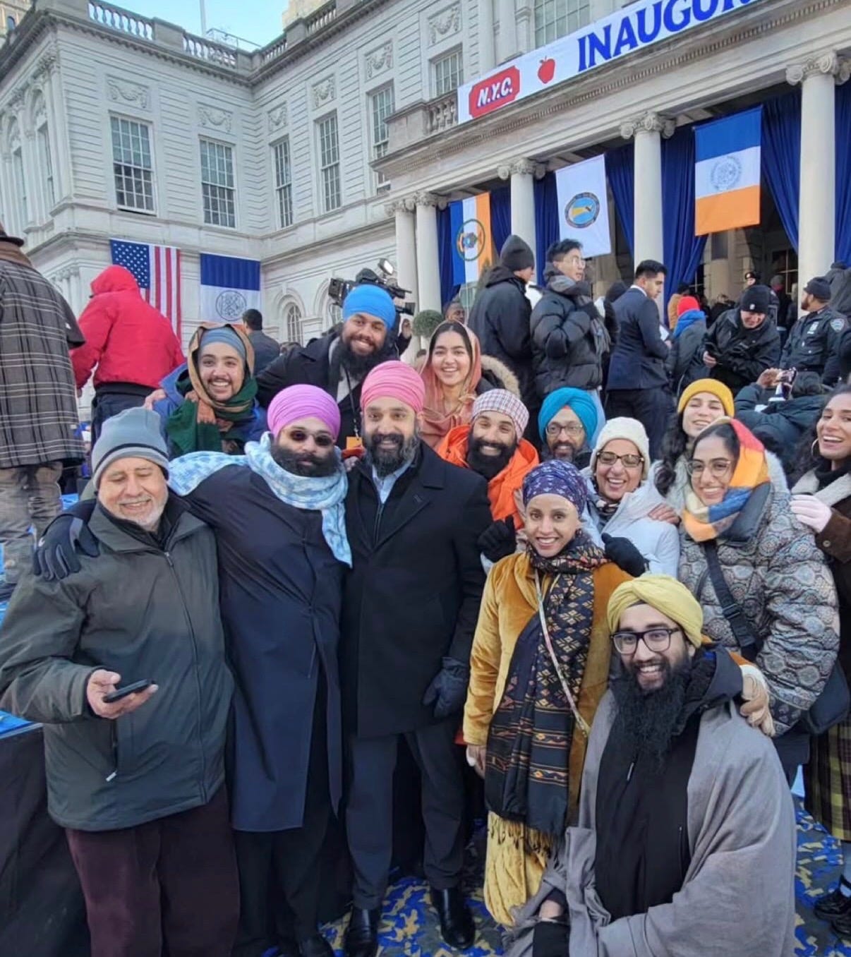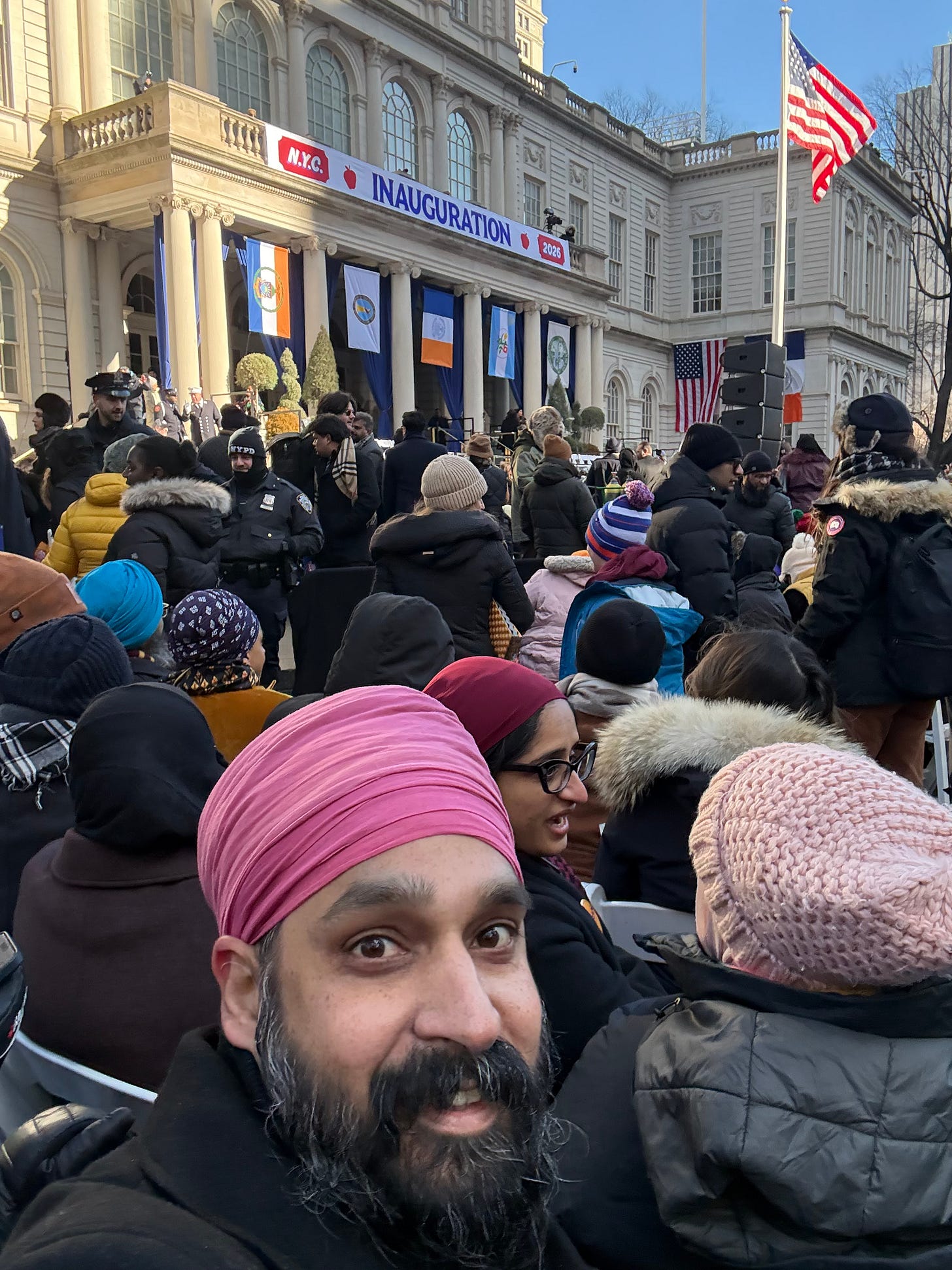 And then, as Zohran finished his remarks and walked across the stage with his wife Rama, the crowd was treated to a closing act. Babbulicious, a Punjabi Sikh singing his hit song, Gaddi Red Challenger. He wore a pink, rounded turban just like I did. I can’t tell you how many people texted me after to ask if I was rapping on stage after the inauguration.